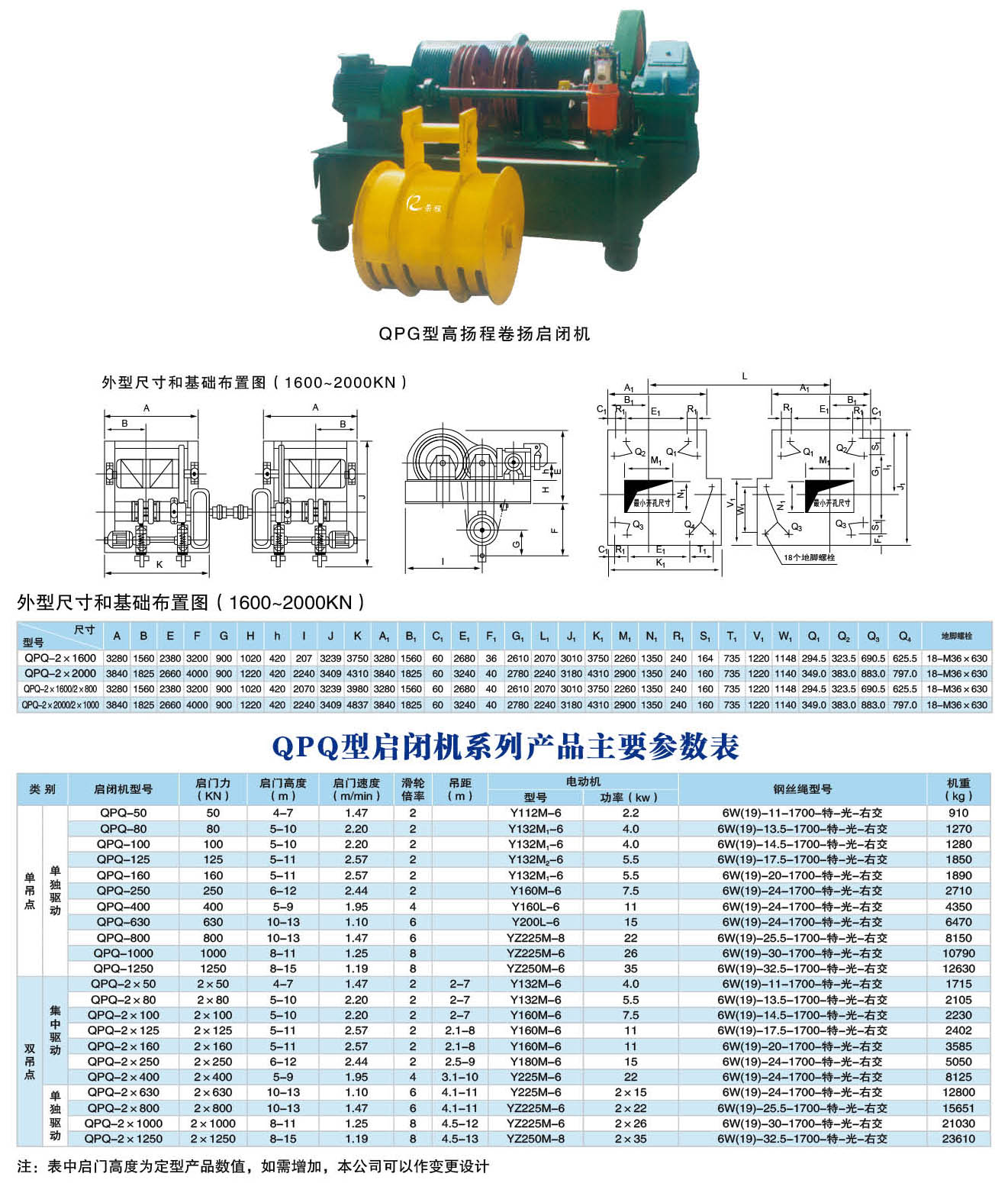 卷揚啟閉機有多種型號:可以分為QPQ型普通卷揚啟閉機、QPK型快速卷揚啟閉機、QPG型高揚程卷揚啟閉機、QPT型臺車式卷揚啟閉機,QPM型門式卷揚啟閉機,QH型弧門卷揚啟閉機。卷揚啟閉機又分為:平門卷揚式啟閉機;弧形門卷揚式啟閉機;雙吊點卷揚式啟閉機;快速卷揚式啟閉機;移動式臺車啟閉機;雙吊點卷揚式啟閉機分為:集中驅(qū)動和單獨驅(qū)動兩種;卷揚式啟閉機手搖、電動兩用式規(guī)格分為:5噸、8噸、12噸、16噸、25噸;電動式規(guī)格分為:40噸、63噸、80噸、100噸、125噸、160噸、200噸,可以根據(jù)用戶要求設(shè)計,并能生產(chǎn)雙吊點卷揚式啟閉機,該機是一種水利工程專用機械,廣泛用于水利工程閘門的啟閉,是農(nóng)田灌溉、水產(chǎn)養(yǎng)殖、農(nóng)業(yè)經(jīng)濟(jì)開發(fā)區(qū)、污水處理廠、水利發(fā)電站、水庫(水閘、堤壩、隧道、管 道)等進(jìn)水、退水閘的配套機械,山區(qū)、平原有、無電地區(qū)均可使用。